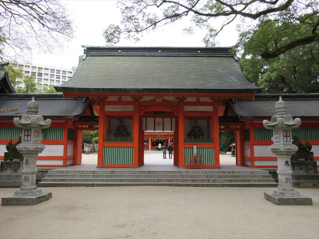 日本三大八幡の一。参道が長い。とにかく長い。博多どんたく、博多山笠と共に、博多三大祭りに数えられる放生会(ほうじょうや)では、この参道一杯に数百店の露店が軒を連ね、活気に溢れる。